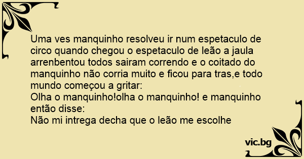 Uma ves manquinho resolveu ir num espetaculo de circo quando chegou o espetaculo de leão a jaula arrenbentou todos sairam correndo e o coitado do manquinho não corria muito e ficou para tras,e todo mundo começou a gritar: