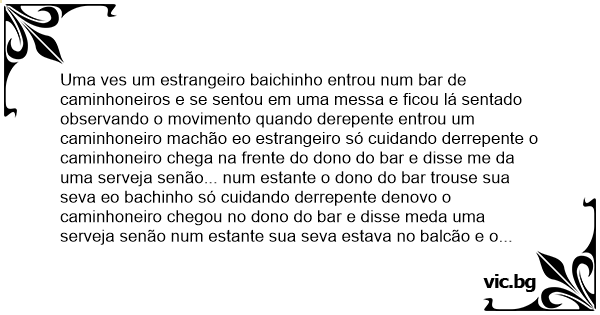Uma ves um estrangeiro baichinho entrou num bar de caminhoneiros e se sentou em uma messa e ficou lá sentado observando o movimento quando derepente entrou um caminhoneiro machão eo estrangeiro só cuidando derrepente o caminhoneiro chega na frente do dono do bar e disse me da uma serveja senão... num estante o dono do bar trouse sua seva eo bachinho só cuidando derrepente denovo o caminhoneiro chegou no dono do bar e disse meda uma serveja senão num estante sua seva estava no balcão e o baichinho enpolgado lá da sua messa chegou na frente do balconista e todo empolgado e disse com uma vóz bem fininha MEDA UMA SERVEJA SENÃO eo balconista todo inrritado RESPONDEU SENÃO O QUE e o baichinho todo cagado respondeu SENÃO PODE SER UM GUARÁNASINHO.