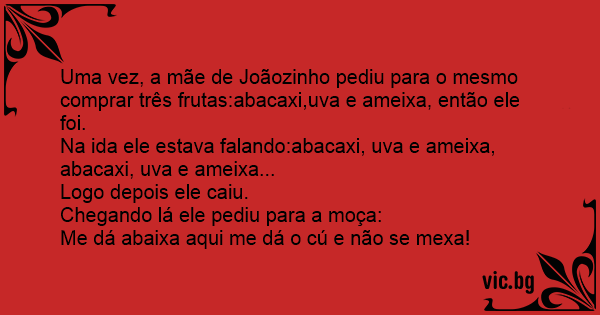 Uma vez, a mãe de Joãozinho pediu para o mesmo comprar três frutas:abacaxi,uva e ameixa, então ele foi.