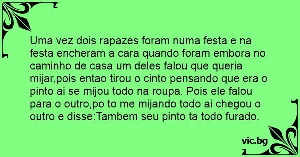 Uma vez dois rapazes foram numa festa e na festa encheram a cara quando foram embora no caminho de casa um deles falou que queria mijar,pois entao tirou o cinto pensando que era o pinto ai se mijou todo na roupa. Pois ele falou para o outro,po to me mijando todo ai chegou o outro e disse:Tambem seu pinto ta todo furado.