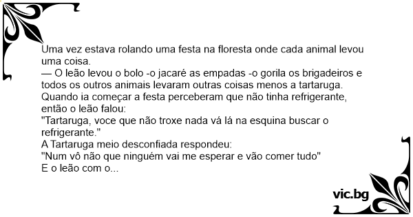 — O leão levou o bolo -o jacaré as empadas -o gorila os brigadeiros e todos os outros animais levaram outras coisas menos a tartaruga.