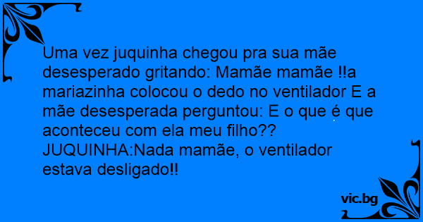 Uma vez juquinha chegou pra sua mãe desesperado gritando: Mamãe mamãe !!a mariazinha colocou o dedo no ventilador E a mãe desesperada perguntou: E o que é que aconteceu com ela meu filho??