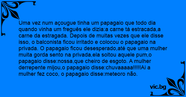 Uma vez num açougue tinha um papagaio que todo dia quando vinha um freguês ele dizia:a carne tá estracada,a carne da estragada. Depois de muitas vezes que ele disse isso, o balconista ficou irritado e colocou o papagaio na privada. O papagaio ficou desesperado,até que uma mulher muita gorda sento na privada,ela soltou aquele pum,o papagaio disse:nossa,que cheiro de esgoto. A mulher derrepente mijou,o papagaio disse:chuvaaaaa!!!!!Ai a mulher fez coco, o papagaio disse:meteoro não.