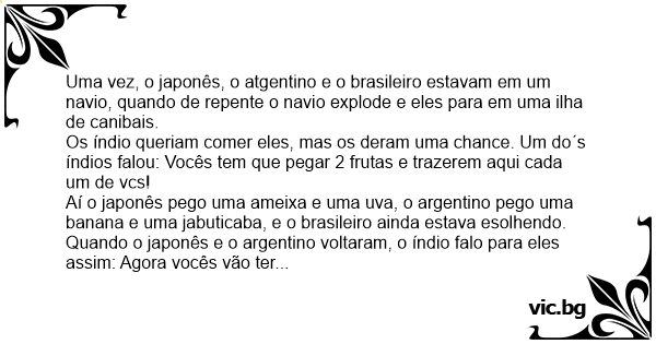Uma vez, o japonês, o atgentino e o brasileiro estavam em um navio, quando de repente o navio explode e eles para em uma ilha de canibais.