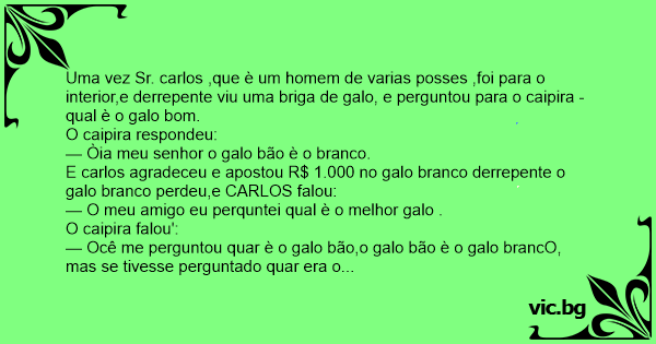 Uma vez Sr. carlos ,que è um homem de varias posses ,foi para o interior,e derrepente viu uma briga de galo, e perguntou para o caipira -qual è o galo bom.