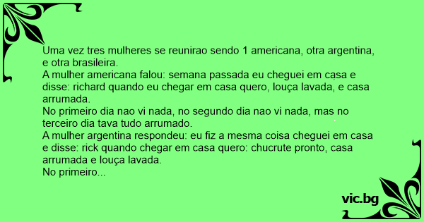 A mulher argentina respondeu: eu fiz a mesma coisa cheguei em casa e disse: rick quando chegar em casa quero: chucrute pronto, casa arrumada e louça lavada.