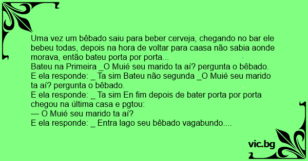 Uma vez um bêbado saiu para beber cerveja, chegando no bar ele bebeu todas, depois na hоrа de voltar para caasa não sabia aonde morava, então bateu porta por porta...