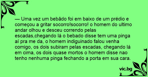 — Uma vez um bebâdo foi em baixo de um prédio e começou a gritar socorro!socorro! o homem do ultimo andar olhou e desceu correndo pelas escadas,chegando lá o bebado disse tem uma pinga aí pra me da, o homem indiguinado falou venha comigo, os dois subiram pelas escadas, chegando lá em cima, os dois quase mortos o homem disse nao tenho nenhuma pinga fechando a porta em sua cara.