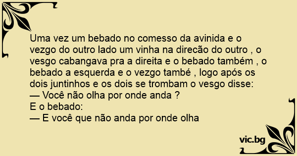 Uma vez um bebado no comesso da avinida e o vezgo do outro lado um vinha na direcão do outro , o vesgo cabangava pra a direita e o bebado também , o bebado a esquerda e o vezgo també , logo após os dois juntinhos e os dois se trombam o vesgo disse: