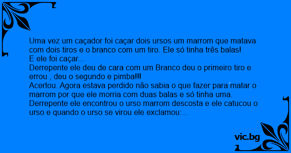 Uma vez um caçador foi caçar dois ursos um marrom que matava com dois tiros e o branco com um tiro. Ele só tinha três balas!