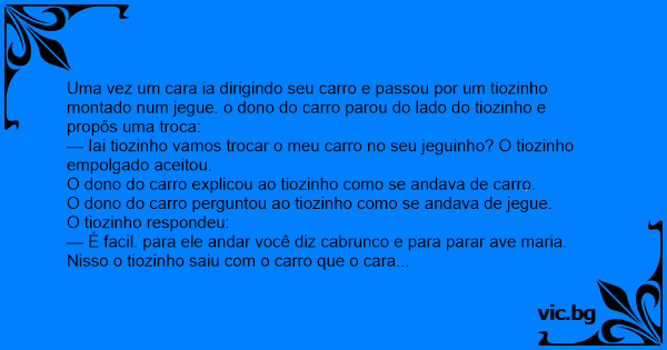 — Iai tiozinho vamos trocar o meu carro no seu jeguinho? O tiozinho empolgado aceitou.