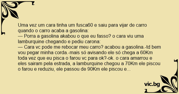 Uma vez um cara tinha um fusca60 e saiu para vijar de carro quando o carro acaba a gasolina: