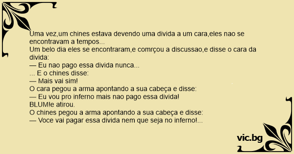 Uma vez,um chines estava devendo uma divida a um cara,eles nao se encontravam a tempos...