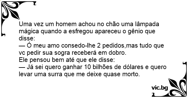 Uma vez um homem achou no chão uma lâmpada mágica quando a esfregou apareceu o gênio que disse: