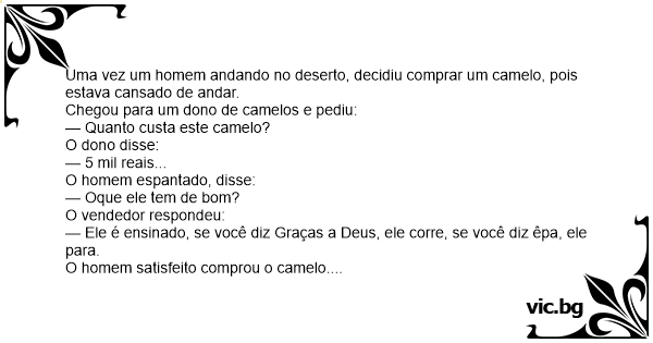 Embarcou e logo disse de cara 5 vezes Graças a Deus,o camelo saiu disparado até que ele disse êpa, e o camelo parou.