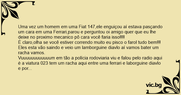 Uma vez um homem em uma Fiat 147,ele enguiçou aí estava pasçando um cara em uma Ferrari,parou e perguntou oi amigo quer que eu lhe deixe no proximo mecanico pô cara você faria isso!!!!