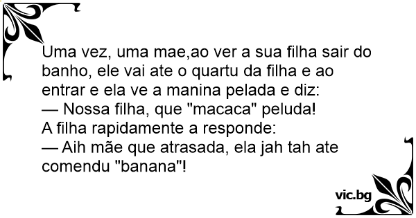 A mãe chega no quarto, encontra a filha pelada e diz: — Filha, a macaquinha está peluda,hein!? A filha faz uma cara e diz : — Xii... Mãe, chego atrasada ,a macaquinha já está até comendo banana.