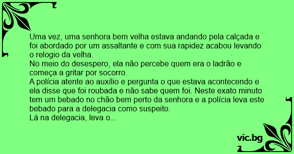 A polícia atente ao auxílio e pergunta o que estava acontecendo e ela disse que foi roubada e não sabe quem foi. Neste exato minuto tem um bebado no chão bem perto da senhora e a polícia leva este bebado para a delegacia como suspeito.