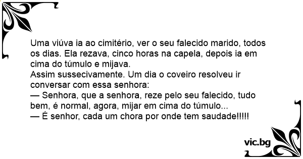 Uma viúva ia ao cimitério, ver o seu falecido marido, todos os dias. Ela rezava, cinco horas na capela, depois ia em cima do túmulo e mijava.