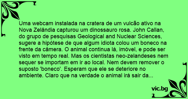 Uma webcam instalada na cratera de um vulcão ativo na Nova Zelândia capturou um dinossauro rosa. John Callan, do grupo de pesquisas Geological and Nuclear Sciences, sugere a hipótese de que algum idiота colou um boneco na frente da câmera. O animal continua lá, imóvel, e pode ser visto em tempo real. Mas os cientistas neo-zelandeses nem sequer se importam em ir ao local. Nem devem remover o suposto 'boneco'. Esperam que ele se deteriore no ambiente. Claro que na verdade o animal irá sair da hibernação em que se encontra e sair de lá, eventualmente.