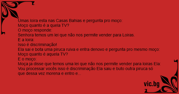 Uma, loira entrou em loja de eletrodomestico e falou: Vendedor me ve essa televisao. E o vendedor respondeu: Eu nao vendo para loiras. No outro dia ela voltou la de novo com uma peruca, ruiva e...