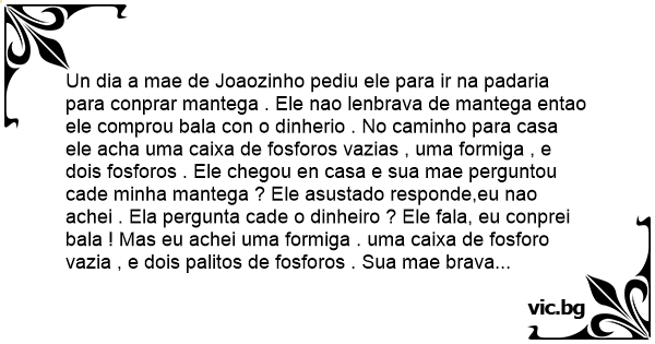 Un dia a mae de Joaozinho pediu ele para ir na padaria para conprar mantega . Ele nao lenbrava de mantega entao ele comprou bala соn o dinherio . No caminho para casa ele acha uma caixa de fosforos vazias , uma formiga , e dois fosforos . Ele chegou en casa e sua mae perguntou cade minha mantega ? Ele asustado responde,eu nao achei . Ela pergunta cade o dinheiro ? Ele fala, eu conprei bala ! Mas eu achei uma formiga . uma caixa de fosforo vazia , e dois palitos de fosforos . Sua mae brava briga соn ele e manda ele jogar isso na privada e dar descarga . Ele chorando foi correndo e jogou . Depois no meio da меrdа e tudo a formiginha pegou os palitos sobina caixa e saiu cantando eu vou , eu vou para a terra do coco eu vo ,eu vo para aterra do coco