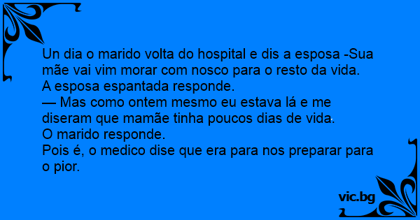 Un dia o marido volta do hospital e dis a esposa -Sua mãe vai vim morar com nosco para o resto da vida.