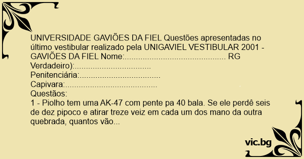UNIVERSIDADE GAVIÕES DA FIEL Questões apresentadas no último vestibular realizado pela UNIGAVIEL VESTIBULAR 2001 - GAVIÕES DA FIEL Nome:............................................. RG Verdadeiro):.................................. Penitenciária:.................................... Capivara:.........................................
