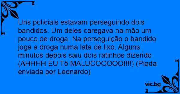 Uns policiais estavam perseguindo dois bandidos. Um deles caregava na mão um pouco de droga. Na perseguição o bandido joga a droga numa lata de lixo. Alguns minutos depois saiu dois ratinhos dizendo (AHHHH EU Tô MALUCOOOOO!!!!) (Piada enviada por Leonardo)