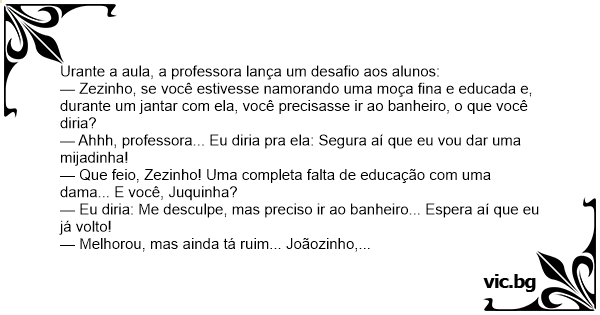 — Ahhh, professora... Eu diria pra ela: Segura aí que eu vou dar uma mijadinha!