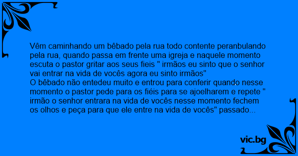 Vêm caminhando um bêbado pela rua todo contente peranbulando pela rua, quando passa em frente uma igreja e naquele momento escuta o pastor gritar aos seus fieis " irmãos eu sinto que o senhor vai entrar na vida de vocês agora eu sinto irmãos"