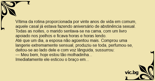 Até que um dia, a esposa não agüentou mais. Comprou uma langerie extremamente sensual, produziu-se toda, perfumou-se, deitou-se ao lado dele e com voz lânguida, sussurrou: