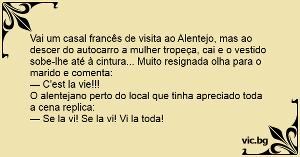 Vai um casal francês de visita ao Alentejo, mas ao descer do autocarro a mulher tropeça, cai e o vestido sobe-lhe até à cintura... Muito resignada olha para o marido e comenta: