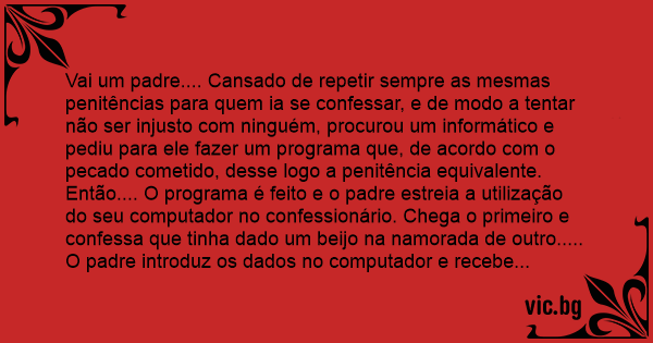 Vai um padre.... Cansado de repetir sempre as mesmas penitências para quem ia se confessar, e de modo a tentar não ser injusto com ninguém, procurou um informático e pediu para ele fazer um programa que, de acordo com o pecado cometido, desse logo a penitência equivalente. Então.... O programa é feito e o padre estreia a utilização do seu computador no confessionário. Chega o primeiro e confessa que tinha dado um beijo na namorada de outro..... O padre introduz os dados no computador e recebe como resposta ''Tem que rezar 10 Ave Marias''. O segundo.... Tinha amassado não sei quem...''20 Ave Marias''... Vai por aí, até que chega um que fala que tinha pecado.... Tinha quase transado com a namorada... - Como quase ?- Pergunta o padre. - é... Ué.... Acabei só pondo a cabecinha.... Não tive coragem para continuar.... Aí, o padre vai introduzir os dados no computador e.... Recebe como resposta que aquele pecado não existia. Mas o cara, queria a todo o custo pagar pelo seu pecado..... O padre dando em doido já com a mer*da do computador que não lhe dava resposta.... Aí fala :