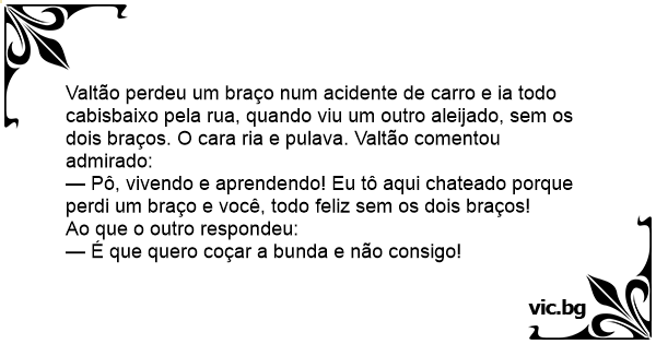 Valtão perdeu um braço num acidente de carro e ia todo cabisbaixo pela rua, quando viu um outro aleijado, sem os dois braços. O cara ria e pulava. Valtão comentou admirado: