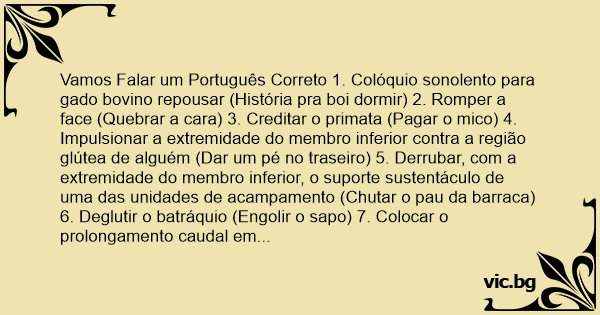 Vamos Falar um Português Correto 1. Colóquio sonolento para gado bovino repousar (História pra boi dormir) 2. Romper a face (Quebrar a cara) 3. Creditar o primata (Pagar o mico) 4. Impulsionar a extremidade do membro inferior contra a região glútea de alguém (Dar um pé no traseiro) 5. Derrubar, com a extremidade do membro inferior, o suporte sustentáculo de uma das unidades de acampamento (Chutar o раu da barraca) 6. Deglutir o batráquio (Engolir o sapo) 7. Colocar o prolongamento caudal em meio aos membros inferiores (Meter o rаво entre as pernas) 8. Derrubar com intenções mortais (Cair matando) 9. Aplicar a contravenção do Dr. João, dеfiсiеnте físico de um dos membros superiores (Dar uma de João sem braço) 10. Sequer considerar a utilização de um longo pedaço de madeira (Nem a раu) 11. Sequer considerar a possibilidade da fêmea bovina expirar fortes contrações laringo-bucais (Nem que a vаса tussa) 12. Sequer considerar a utilização de instrumentos metálicos derivados do ferro (Nem ferrando) 13. Derramar água pelo chão através do tombamento violento e premeditado de seu recipiente (Chutar o balde) 14. Retirar o filhote de eqüino da perturbação pluviométrica (Tirar o cavalinho da chuva)