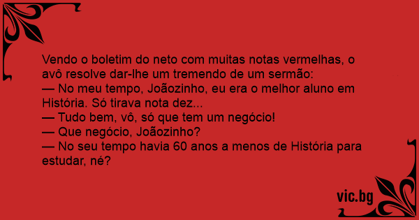 — No meu tempo, Joãozinho, eu era o melhor aluno em História. Só tirava nota dez...