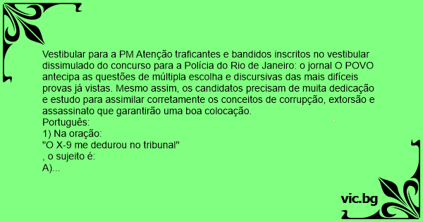 Vestibular para a PM Atenção traficantes e bandidos inscritos no vestibular dissimulado do concurso para a Polícia do Rio de Janeiro: o jornal O POVO antecipa as questões de múltipla escolha e discursivas das mais difíceis provas já vistas. Mesmo assim, os candidatos precisam de muita dedicação e estudo para assimilar corretamente os conceitos de corrupção, extorsão e assassinato que garantirão uma boa colocação.
