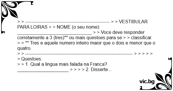 > > ------------------------------------------------------- > > VESTIBULAR PARA LOIRAS > > NOME (o seu nome): _____________________________ > > Voce deve responder corretamente a 3 (tres)** ou mais questoes para se > > classificar.