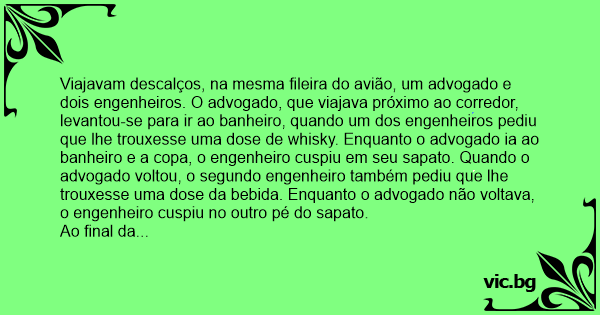 Viajavam descalços, na mesma fileira do avião, um advogado e dois engenheiros. O advogado, que viajava próximo ao corredor, levantou-se para ir ao banheiro, quando um dos engenheiros pediu que lhe trouxesse uma dose de whisky. Enquanto o advogado ia ao banheiro e a copa, o engenheiro cuspiu em seu sapato. Quando o advogado voltou, o segundo engenheiro também pediu que lhe trouxesse uma dose da bebida. Enquanto o advogado não voltava, o engenheiro cuspiu no outro pé do sapato.