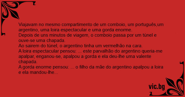 Кој го плесна гркот? Mit dem Zug durch den Tunnel gefährliche Zugfahrt Το τρένο Ο Γάλλος και ο Γερμανός Στο ίδιο βαγόνι Το φιλί Влак, в купето пътуват девойка с младата си майка и войник със старшина. Ein Deutscher, ein Österreicher, ein hübsches Mädchen und eine Nonne sitzen in einem Zugabteil. Седят си във влаково купе грък, македонец, млада жена с големи цици и австралийска баба. Пътуват в едно купе, майка с щерка и старшина с войник. Влакът влиза в тунел и се чува силно пляяяс. Излиза влака от тунела, а старшината се държи за бузата и си мисли: В купе на влак пътуват майка с дъщеря си и двама военни - единия старшина, другия редник. In einem Zugabteil sitzen ein Unternehmer und sein Arbeiter mit einer alten und einer hübschen, jungen Frau zusammen, als der Zug in einen Tunnel fährt. A young Programmer and his Project Manager board a train headed through the mountains on its way to Wichita. They can find no place to sit except for two seats right across the aisle from a young woman and her grandmother. Van un madrileño,un valenciano, una guapa y una fea en un vagón de tren....de repente el tren pasa x un tunel a oscuras y se oye PUM!!!!!.... Поезд. Едут генерал, курсант и мать с дочерью. Заезжают в тоннель и слышен звук пощечины. Мысли матери: Under andra världskriget. En tysk officer, en söt ung kvinna, en gammal gumma och en rumän sitter alla i samma kupe i ett rumänskt tåg Allt blir mörkt när tåget kommer in i en tunnel. Man hör först en kyss, sedan en kraftig smäll. Ingen säger något, men när det blir ljust i kupén igen ser man... Sitzen ein Deutscher, ein Österreicher, eine Nonne und eine junge Frau in einem Zugabteil. Der Zug fährt schließlich durch einen Tunnel und es wird stockdunkel. Plötzlich hört man ein Klatschen und einen Schmerzenslaut. Es wird wieder hell. Alle... Viajaban en un Tren, una hermoza mujer, una vieja Fea, un Chileno y un Peruano. El tren paso por un tunel y derrepente en medio de la oscuridad se escucho un tremendo cachetadon, al finalizar el... There was an Scotsman, an Englishman and Claudia Schiffer sitting together in a carriage in a train going through Wales. Suddenly the train went through a tunnel and as it was an old style train,... Een Belg, een Marokkaan, een non en een bloedmooie meid met een kort rokje en een paar ferme tieten zitten in een treincoupe. Op een gegeven moment rijdt de trein een tunnel in, het licht werkt... En un vagón de tren viajan una gorda, una rubia guapísima, un alemán y un andaluz. De pronto el tren se mete en un túnel y se queda el vagón a oscuras. Entonces se oye un guantazo enorme: ¡ZASCA!... An Englishman, a Frenchman, a ravishing blonde and an old lady are sharing a compartment on a train as it winds its way through the Alps. Every now and then the train passes through a tunnel,... In einem Eisenbahn-Abteil sitzen eine umwerfende Blondine, eine Nonne, ein Holländer und ein Deutscher. Der Zug fährt in einen Tunnel und man hört den Knall einer Ohrfeige. Mit roter Wange sieht... En una cabina de tren viajaban un mexicano, un yanqui, una rubia espectacular y una gorda espantosa... Después de unos minutos de viaje, el tren pasa por un tunel, y se oye el sonido de una... Valgkamp På en togtur fra København til Jylland, sad Mogens Lykktoft, Anders Fogh Rasmussen, en smuk blondine og en grim, fed kvinde i samme kupe. Da de kørte gennem Storebæltstunnelen, hørtes... W pociągu w jednym przedziale jadą matka z 18-letnią córką, generał i szeregowiec. Pociąg wjechał do tunelu, nagle słychać plaśnięcie jakby uderzenie w policzek. Co myśli każdy z pasażerów gdy... *Dünya Savaşı arefesinde; bir Nazi subayı, bir yaşlı kadın, bir delikanlı ve bir de genç kız bir tren kompartımanında yolculuk etmektedirler. Tren bir yerde tünele girer. Karanlıkta, bir öpücük... In uno scompartimento ferroviario ci sono una bella ragazza, una rispettabile vecchia signora, un sergente ed un soldato semplice. Il treno entra in una galleria buia e, per il solito... Un beau jour, dans un train, Chirac, Sarkozy et une belle norvégienne voyagent dans le même compartiment. Ils roulent ainsi, sans se parler, sans que rien ne se passe pendant des heures. Soudain,... Bir albay, bir er, bir yaşlı kadın ve bir de genç kız trende aynı kompartımanda yolculuk etmektedir. Tren bir tünele girip kompartıman Karardığı zaman, mucuk bir öpücük sesi ve ardından... Im D-Zug nach Zürich sitzen ein Schweizer Jüngling , ein großer Amerikaner , ein biederer alter Österreicher und eine Mutter mit ihrer 18jährigen Tochter zusammen in einem Abteil. Schließlich... Un jour dans un train, en Savoie, un Parisien (avec son écharpe du PSG), un Marseillais (avec son écharpe de l'OM) et une jolie Norvégienne sont dans le même compartiment. Ils roulent comme ça,... Estavam em um trem (na europa) 1 linda jovem francesa, 1 velha alemã, 1 brasileiro e 1 argentino. Os quatro viajavam no mesmo vagão quietos quando, ao passar por um túnel, tudo ficou as escuras. De... Sitting together on a train was Obama, George Bush Jr., a little old lady, and a young blonde girl with large breasts. The train goes into a dark tunnel and a few seconds later there is the sound... Estavam em um trem, uma velha, uma moça muito boa, um argentino e um brasileiro. O trem entrou num túnel muito escuro. Escutou-se um beijo e em seguida ossom de um tapa. A velha pensou: —... Een Nederlander, een non, een Duitser en een dom blondje zitten in de trein.
