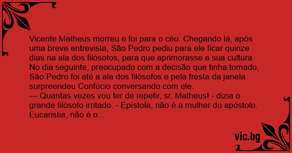 Vicente Matheus morreu e foi para o céu. Chegando lá, após uma breve entrevista, São Pedro pediu para ele ficar quinze dias na ala dos filósofos, para que aprimorasse a sua cultura.