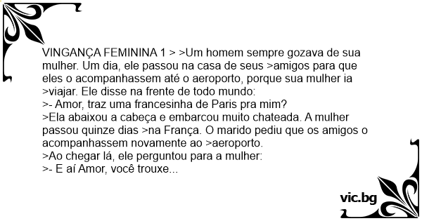 VINGANÇA FEMININA 1 > >Um homem sempre gozava de sua mulher. Um dia, ele passou na casa de seus >amigos para que eles o acompanhassem até o aeroporto, porque sua mulher ia >viajar. Ele disse na frente de todo mundo:
