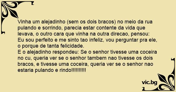 Vinha um alejadinho (sem os dois bracos) no meio da rua pulando e sorrindo, parecia estar contente da vida que levava, o outro cara que vinha na outra direcao, pensou: