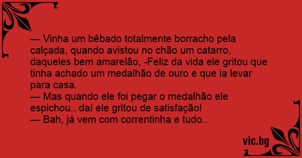 — Vinha um bêbado totalmente borracho pela calçada, quando avistou no chão um catarro, daqueles bem amarelão, -Feliz da vida ele gritou que tinha achado um medalhão de ouro e que ia levar para casa.