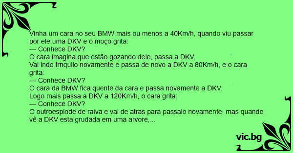 Vinha um cara no seu BMW mais ou menos a 40Km/h, quando viu passar por ele uma DKV e o moço grita:
