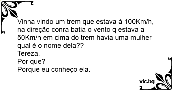 Vinha vindo um trem que estava à 100Km/h, na direção conra batia o vento q estava a 50Km/h em cima do trem havia uma mulher qual é o nome dela??