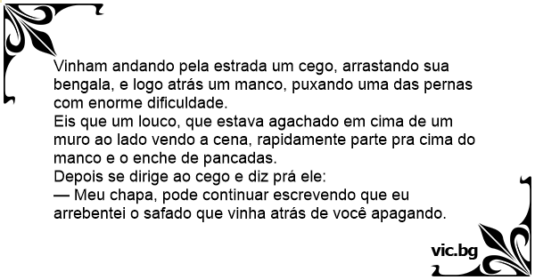 Vinham andando pela estrada um cego, arrastando sua bengala, e logo atrás um manco, puxando uma das pernas com enorme dificuldade.