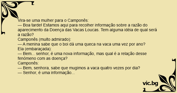 — Boa tarde! Estamos aqui para recolher informação sobre a razão do aparecimento da Doença das Vacas Loucas. Tem alguma idéia de qual será a razão?
