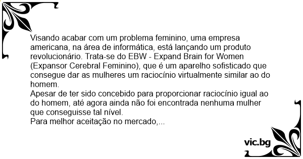 Visando acabar com um problema feminino, uma empresa americana, na área de informática, está lançando um produto revolucionário. Trata-se do EBW - Expand Brain for Women (Expansor Cerebral Feminino), que é um aparelho sofisticado que consegue dar as mulheres um raciocínio virtualmente similar ao do homem.